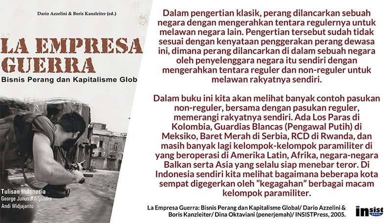 *Rehal buku: La Empresa Guerra: Bisnis Perang dan Kapitalisme Global/ Dario Azzelini & Boris Kanzleiter/ Dina Oktaviani (penerjemah)/ Onny Wiranda (penyunting)/ INSISTPress, 2005.