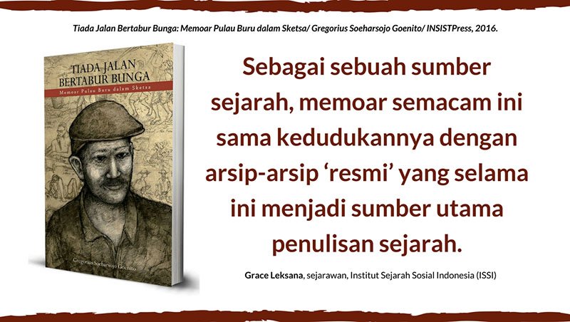 *Info buku: Tiada Jalan Bertabur Bunga: Memoar Pulau Buru dalam Sketsa/ Gregorius Soeharsojo Goenito/ INSISTPress, 2016.