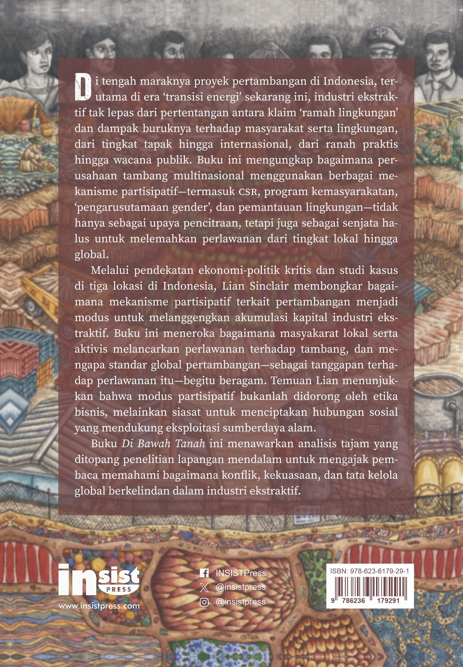 Melalui pendekatan ekonomi-politik kritis dan studi kasus di tiga lokasi di Indonesia, Lian Sinclair membongkar bagaimana mekanisme partisipatif terkait pertambangan menjadi modus untuk melanggengkan akumulasi kapital industri ekstaktif. Buku ini meneroka bagaimana masyakarat lokal serta aktivis melancarkan perlawanan terhadap tambang, dan mengapa standar global pertambangan—sebagai tanggapan terhadap perlawanan itu—begitu beragam. Temuan Lian menunjukkan bahwa modus partisipatif bukanlah didorong oleh etika bisnis, melainkan siasat untuk menciptakan hubungan sosial yang mendukung eksploitasi sumberdaya alam.