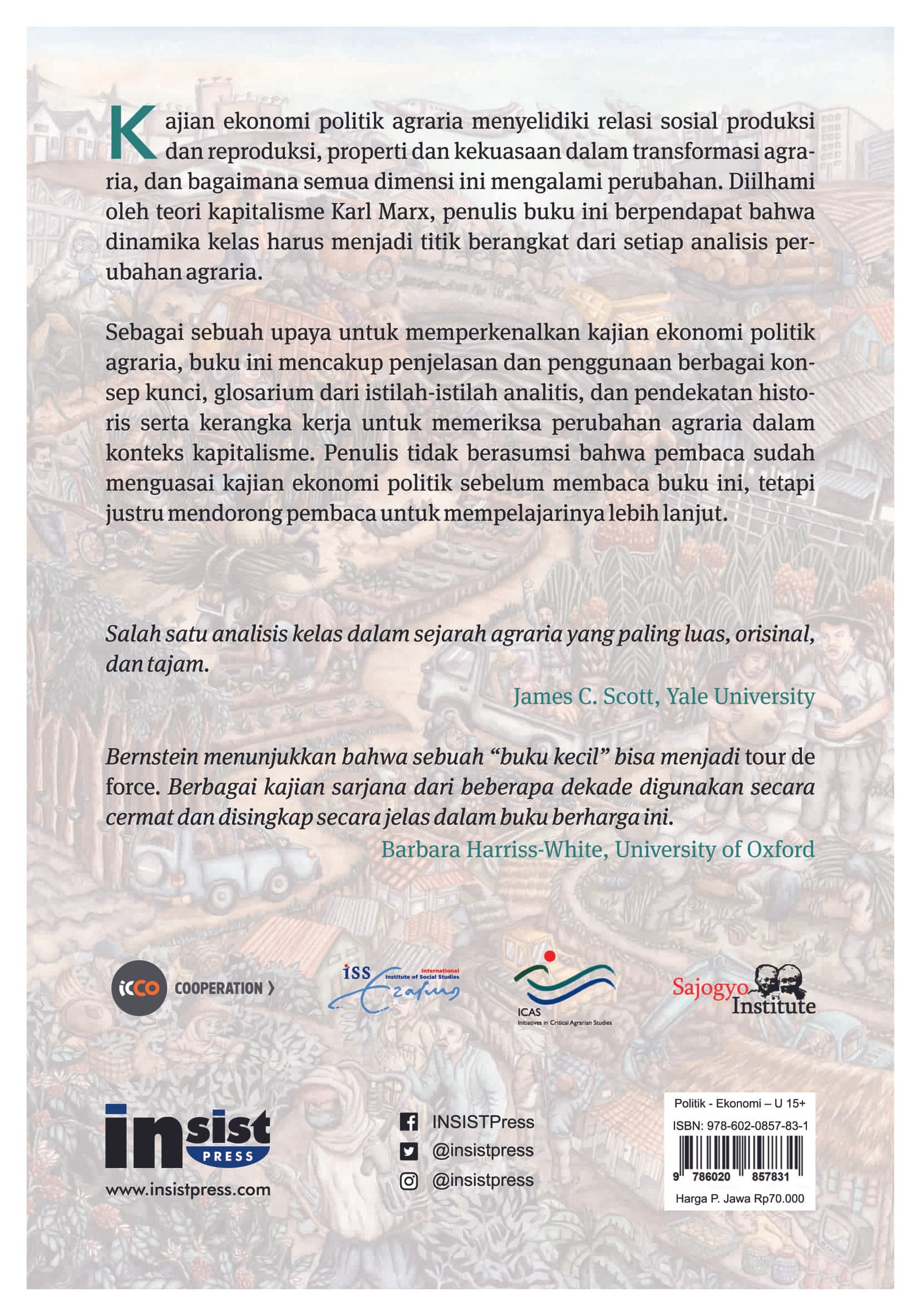 Kajian ekonomi politik agraria menyelidiki relasi sosial produksi dan reproduksi, properti dan kekuasaan dalam transformasi agraria, dan bagaimana semua dimensi ini mengalami perubahan. Diilhami oleh teori kapitalisme Karl Marx, penulis buku ini berpendapat bahwa dinamika kelas harus menjadi titik berangkat dari setiap analisis perubahan agraria.