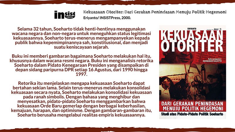 *Rehal buku: Kekuasaan Otoriter: Dari Gerakan Penindasan Menuju Politik Hegemoni (Studi atas Pidato-pidato Politik Soeharto)/ Eriyanto/ INSISTPress, 2000.