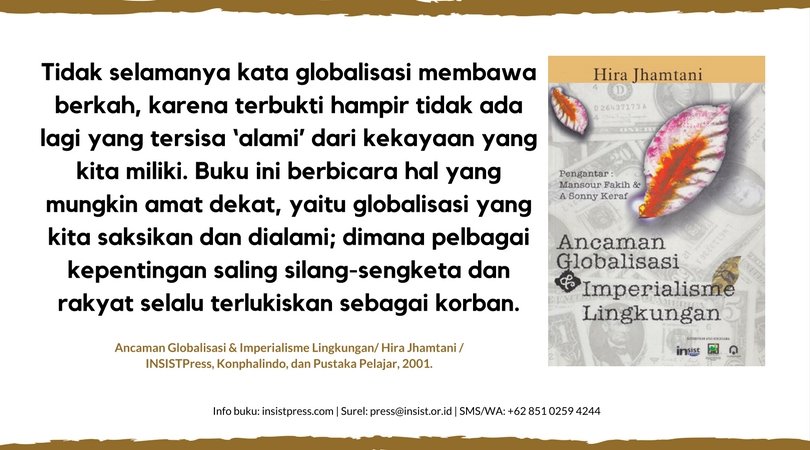 *Rehal buku: Ancaman Globalisasi & Imperialisme Lingkungan/ Hira Jhamtani/ INSISTPress, Konphalindo, dan Pustaka Pelajar, 2001.
