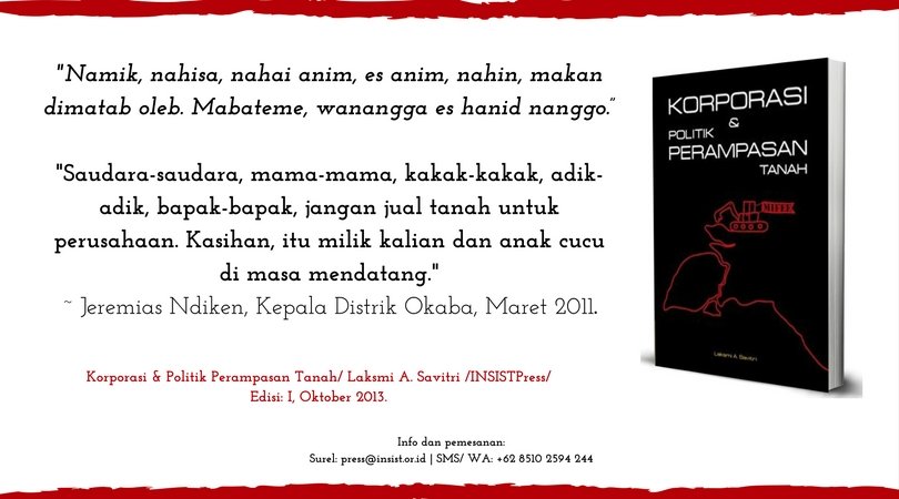 *Rehal buku: Korporasi & Politik Perampasan Tanah/ Laksmi A. Savitri/ INSISTPress/ Edisi: I, Oktober 2013.