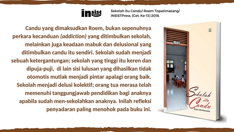 *Rehal buku: Sekolah Itu Candu/ Roem Topatimasang/ INSISTPress, (Cet. Ke-13) 2018.