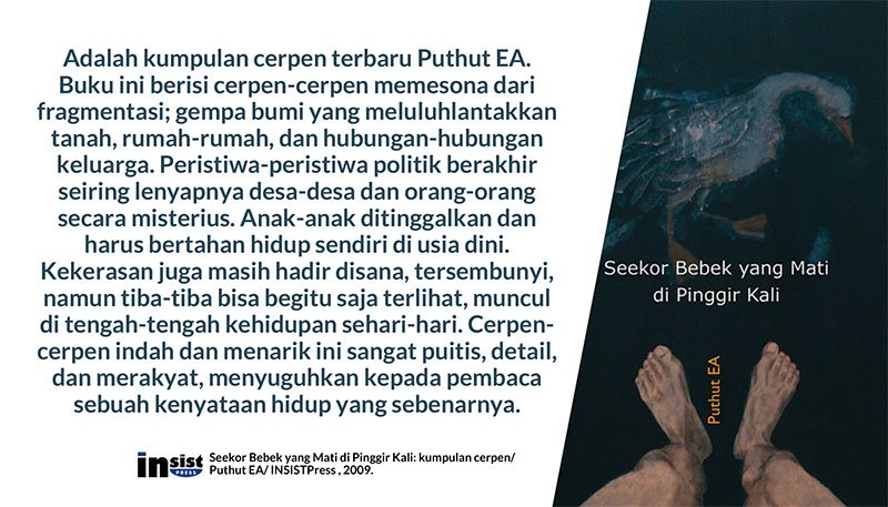*Rehal buku: Seekor Bebek yang Mati di Pinggir Kali: kumpulan cerpen/ Puthut EA/ INSISTPress, 2009.