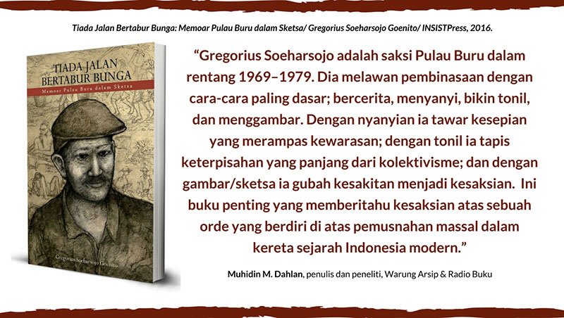 *Info buku: Tiada Jalan Bertabur Bunga: Memoar Pulau Buru dalam Sketsa/ Gregorius Soeharsojo Goenito/ INSISTPress, 2016.