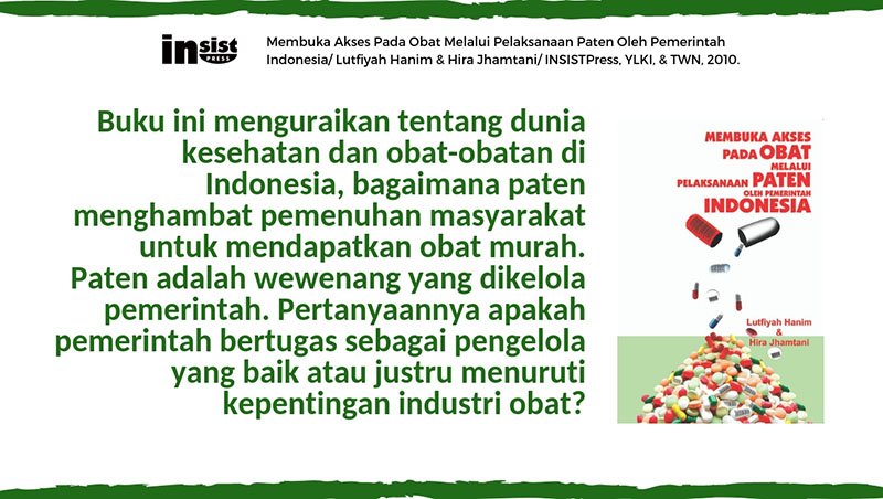 *Rehal buku: Membuka Akses Pada Obat Melalui Pelaksanaan Paten Oleh Pemerintah Indonesia/ Lutfiyah Hanim & Hira Jhamtani/ INSISTPress, YLKI, & TWN, 2010.