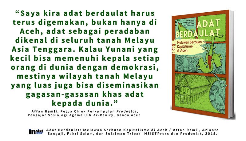*Rehal buku: Adat Berdaulat: Melawan Serbuan Kapitalisme di Aceh / Affan Ramli, Arianto Sangaji, Fahri Salam, dan Sulaiman Tripa/ INSISTPress dan Prodeelat, 2015.