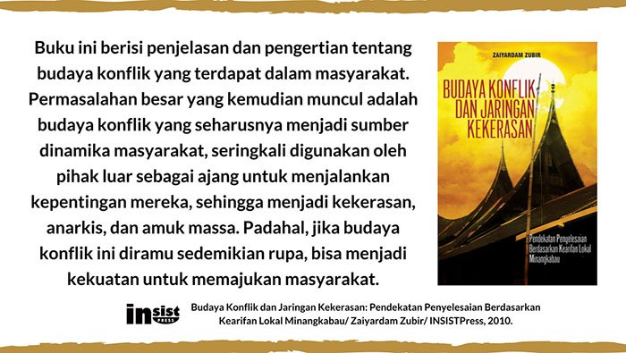 *Rehal buku: Budaya Konflik dan Jaringan Kekerasan: Pendekatan Penyelesaian Berdasarkan Kearifan Lokal Minangkabau/ Zaiyardam Zubir/ INSISTPress, 2010.