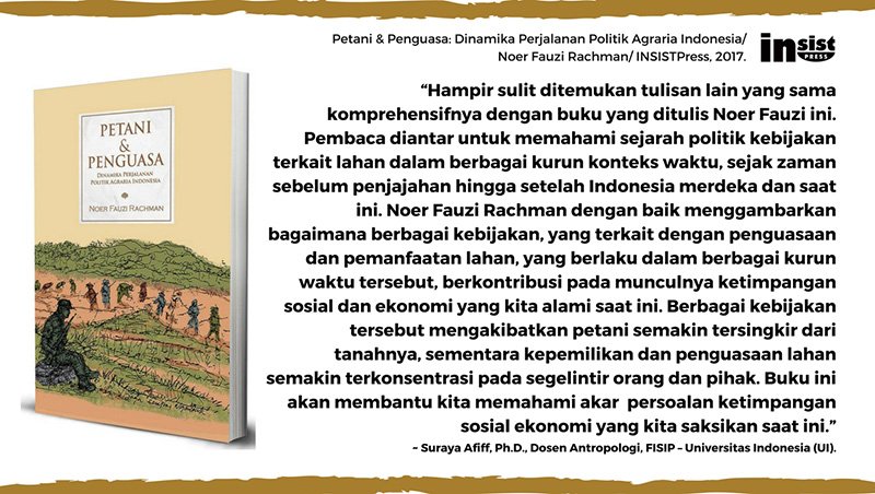“Hampir sulit ditemukan tulisan lain yang sama komprehensifnya dengan buku yang ditulis Noer Fauzi ini. Pembaca diantar untuk memahami sejarah politik kebijakan terkait lahan dalam berbagai kurun konteks waktu, sejak zaman sebelum penjajahan hingga setelah Indonesia merdeka dan saat ini. Noer Fauzi Rachman dengan baik menggambarkan bagaimana berbagai kebijakan, yang terkait dengan penguasaan dan pemanfaatan lahan, yang berlaku dalam berbagai kurun waktu tersebut, berkontribusi pada munculnya ketimpangan sosial dan ekonomi yang kita alami saat ini. Berbagai kebijakan tersebut mengakibatkan petani semakin tersingkir dari tanahnya, sementara kepemilikan dan penguasaan lahan semakin terkonsentrasi pada segelintir orang dan pihak. Buku ini akan membantu kita memahami akar  persoalan ketimpangan sosial ekonomi yang kita saksikan saat ini.”